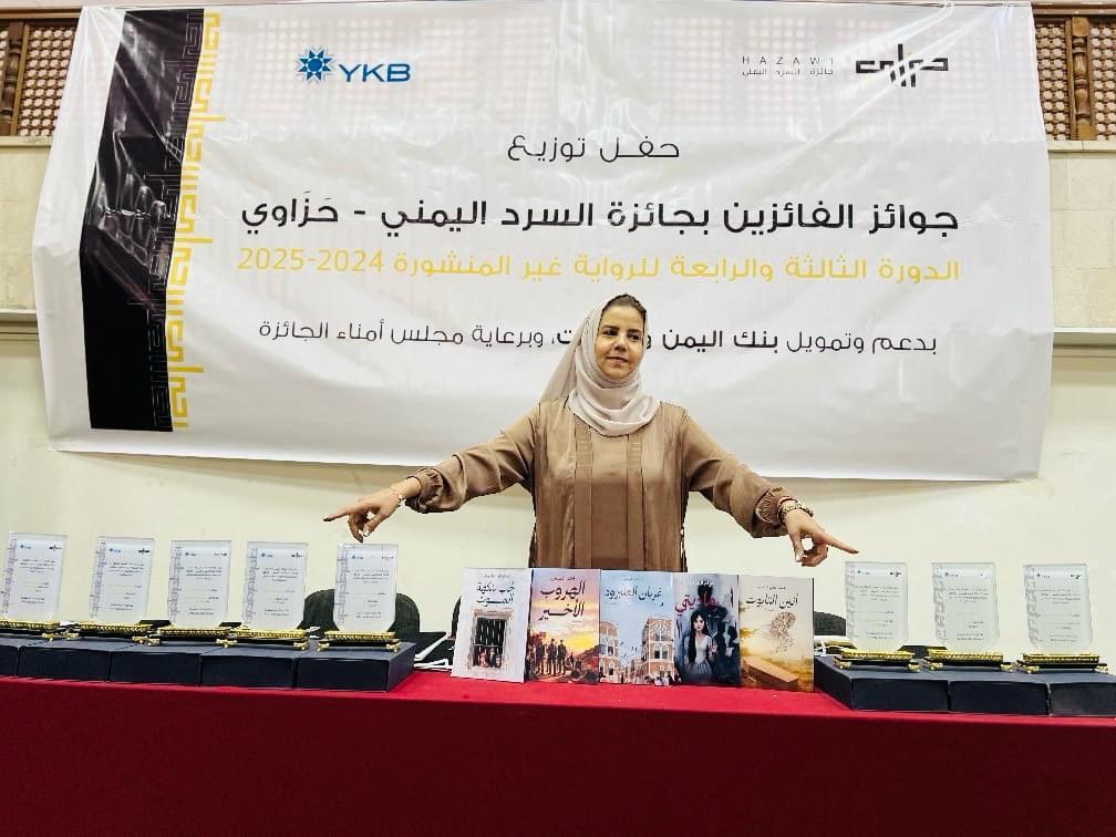 وأضافت أن ارتباط جائزة حزاوي باسم بنك اليمن والكويت يحمل دلالة عميقة على وعي البنك بدوره المركّب: الدور الاقتصادي الذي يسهم في التنمية، والدور الثقافي والاجتماعي الذي يسهم في ترميم الروح العامة، مؤكدةً أن الثقافة والاقتصاد ليسا عالمين منفصلين، بل ركيزتين لأي مشروع وطني يتطلع إلى المستقبل بعين مفتوحة على الأمل.